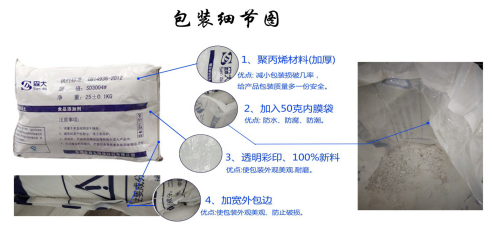 20公斤/袋,25公斤/袋,PP聚丙烯塑复合袋或三层牛皮纸袋、500公斤集装袋等。